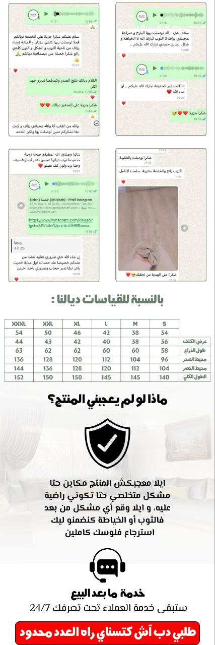 لكي الحق سيدتي في تقليب المنتج قبل دفع المال. فالمرجو التأكد من اللون، التفاصيل و الخياطة قبل دفع المال